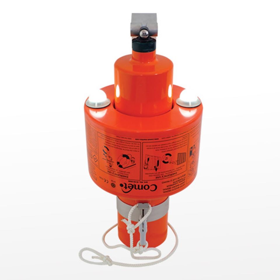 Kombiniertes Mann-über-Bord Signal, bestehend aus einer Boje mit Blinklicht (2 cd für 2h) und Rauch (15 min). Vorgeschrieben in der Berufsschifffahrt, SOLAS-Zulassung.