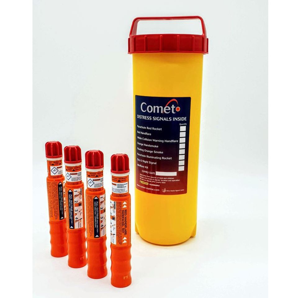 Kombination aus Handfackeln, Fallschirmraketen und Rauchsignalen, abgestimmt auf das Fahrtgebiet. Je weiter man von der Küste entfernt ist, umso mehr aufsteigende Signale sollten an Bord sein. Lieferung erfolgt komplett mit Aufbewahrungsbehälter.