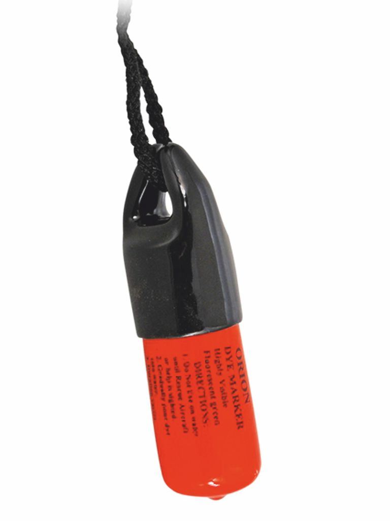 Das umweltfreundliche Pulver des Seewasserfärbers erzeugt einen riesengroßen, grellen Fleck, der aus einer kleinen Kapsel stammt. Diese mißt nur 3 cm im Durchmesser, 10 cm Länge und wiegt knapp 50 Gramm. Mit Hilfe des mitgelieferten Bändsels kann die Dye Marker Kapsel um den Hals getragen oder an der Weste/Kleidung befestigt werden.